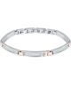 Męska bransoleta Maserati Iconic JM423AVD23 to stylowy dodatek dla każdego gentlemana. Wykonana ze stali, posiada trzy ozdobne, błyszczące elementy, co dodaje jej elegancji. Na jednym z nich widnieje subtelne logo Maserati w kolorze różowego złota. Kolory różowego złota powtarzają się również w łączeniach poszczególnych elementów, co dodaje jej harmonii i spójności.