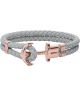 Paul Hewitt Phrep M PH-PH-L-R-GR-M to bransoletka damska wykonana z szarej skóry o splocie na wzór liny. Posiada ozdobne zapięcie w kształcie kotwicy odlanej z różowozłotej stali nierdzewnej. Będzie odpowiednia dla nadgarstka o obwodzie 16-17 cm.
