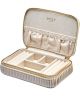 Wolf Bella 781353 to stylowe etui o kompaktowym formacie, które doskonale nadaje się do przechowywania biżuterii w warunkach domowych, jak i w podróży. Kolor kości słoniowej w połączeniu ze złotymi detalami nadaje mu luksusowego charakteru. Wewnątrz znajdują się trzy małe przegródki, dwie funkcjonalne rolki oraz dwie kieszenie w pokrywie, które umożliwiają wygodne i bezpieczne rozdzielenie elementów biżuterii. Dzięki zastosowaniu technologii LusterLoc™, całość stanowi nie tylko eleganckie, ale i trwałe rozwiązanie do długoterminowego przechowywania cennych dodatków.