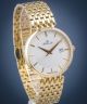 Elegancką stylistykę i wysokojakościowe wykonanie prezentuje męski zegarek Classic L12001.1113Q od szwajcarskiej marki Appella. Model pracuje na mechanizmie kwarcowym ETA F06. Zarówno bransoletę, jak i kopertę wykonano ze stali szlachetnej w kolorze złota. Dodatkowymi atutami są: datownik dni miesiąca oraz twarde szkło szafirowe chroniące białą tarczę.
