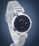 Zegarek damski Appella Diamonds L50001.5185DQ przyciaga uwagę i zdecydowanie zachwyca. Granatowa tarcza została ozdobiona fakturowaniem i połyskującymi diamentami, a także wyposażona w niewielki datownik dnia miesiąca. Zabezpieczenie cyferblatu wykonano ze szkła szafirowego, które w skali twardości Mohsa znajduje się na 9 z 10 możliwych pozycji. Mechanizm kwarcowy ETA F04 Swiss Made odpowiada za precyzyjne odmierzanie godziny. Wodoszczelność oceniono na poziomie 5 ATM.