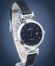 Zegarek damski Appella Diamonds L50001.5285DQ do działania napędza mechanizm kwarcowy ETA F04 Swiss Made. Granatową tarczę zabezpieczoną szafirowym szkiełkiem uzupełniono o datownik dni miesiąca i ozdobiono fakturowaniem oraz diamentami. Srebrna koperta ze stali szlachetnej połączona jest z czarnym, skórzanym paskiem.