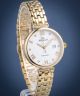 Zegarek damski Appella Diamonds L50006.1183DQ wyposażono w mechanizm kwarcowy ETA F04 Swiss Made. Giloszowaną, białą tarczę ozdobiono 6 diamentami, uzupełniono o datownik dni miesiąca i zabezpieczono szafirowym szkiełkiem. Koperta ze stali szlachetnej w kolorze złotym połączona jest z bransoletą z tego samego materiału i w tym samym kolorze, dodatkowo ozdobiono ją kryształkami.