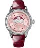 Zegarek damski Aviator Moonflight Gemstone Edition Pink Red Ruby Limited Edition V.1.33.0.417.4 to limitowany model z serii Gemstone, wyróżniający się dekoracyjnym wykończeniem z wykorzystaniem kamieni szlachetnych. Srebrna koperta ze stali szlachetnej została zestawiona z różową tarczą z giloszowaniem, na której umieszczono 10 rubinów, a dodatkowy kamień znalazł się w koronce inspirowanej stylistyką lotniczą. Model wyposażono w wskaźnik faz księżyca oraz datownik dni miesiąca, które zwiększają funkcjonalność zegarka w codziennym użytkowaniu. Za działanie odpowiada mechanizm kwarcowy Swiss Made Ronda 708 z 5 kamieniami łożyskowymi. Całość uzupełnia czerwony pasek skórzany, który podkreśla kolorystyczny charakter modelu. Za ochronę tarczy odpowiada szkło szafirowe z powłoką antyrefleksyjną. Wodoszczelność na poziomie 100 metrów umożliwia pływanie powierzchniowe oraz swobodny kontakt z wodą.