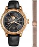 Damski zegarek kwarcowy Aviator Douglas Moonflight V.1.33.2.253.4-W-SET ciekawie łączy czerń i różowe złoto. Koperta tego eleganckiego modelu została wykonana ze stali szlachetnej pokrytej różowozłotą powłoką PVD. Pod odpornym na zarysowania szkłem szafirowym mieści się ciemna tarcza z ozdobnym giloszem i szlifem słonecznym. Urządzenie ma wbudowane datownik dni miesiąca i oryginalny wskaźnik faz księżyca. Do działania napędza je mechanizm kwarcowy Ronda 708. Wodoszczelność rzędu 100 metrów zapewnia ochronę przed zalaniem wnętrza zegarka podczas pływania powierzchniowego. Wraz z zakupem produkt jest obejmowany gwarancją, która trwa 2 lata.