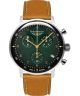 Zegarek Bauhaus Dessau Chronograph 2096-4 wyróżnia się eleganckim zestawieniem kolorów i rozbudowaną funkcjonalnością. Zielona tarcza mieści chronograf, subtarcze z sekundnikiem oraz datownik dni miesiąca. Model wyposażono w szwajcarski mechanizm kwarcowy ETA G10.212 z 4 kamieniami, a jego konstrukcję uzupełniają koperta ze stali szlachetnej, szkło mineralne i brązowy skórzany pasek. Wodoszczelność 50 metrów chroni zegarek podczas codziennego użytkowania.