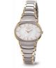 Zegarek damski Boccia Titanium Classic 3255-04 wykonany został z tytanu w kolorze srebrno-złotym. W owalnej kopercie umieszczono biało-perłową tarczę uzupełnioną o złote wskazówki i indeksy. Cyferblat zabezpieczony jest szkiełkiem mineralnym. Model działa na podstawie mechanizmu kwarcowego.