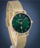 BOWA Milan Green Gold Mesh 34 MI344-04-164M przyciąga wzrok wyrazistym zestawieniem zielonej tarczy i złotej bransolety typu mesh. Smukła koperta ze stali szlachetnej podkreśla elegancki charakter zegarka inspirowanego mediolańskim minimalizmem. Za odmierzanie czasu odpowiada mechanizm kwarcowy Miyota VJ22, a tarczę osłania mineralne szkło. Wodoszczelność na poziomie 3 ATM zapewnia ochronę przed niewielkim kontaktem z wodą.