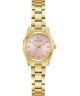 Zegarek Bulova Surveyor 97L187 to damski model o nowoczesnej, biżuteryjnej stylistyce, wyposażony w kopertę ze stali szlachetnej w złotym odcieniu o szerokości 23 mm. Jej fasetowane krawędzie i połączenie powierzchni polerowanych oraz szczotkowanych podkreślają staranne wykończenie projektu. Model działa w oparciu o mechanizm kwarcowy Miyota 2036 z żywotnością baterii wynoszącą około 36 miesięcy. Różowa tarcza z efektem szlifu słonecznego została uzupełniona złotymi wskazówkami i indeksami z wypełnieniem luminescencyjnym. Na froncie znajduje się wysokiej jakości szkło szafirowe, a całość uzupełnia trójogniwowa bransoleta w złotym kolorze z zapięciem motylkowym oraz systemem łatwej wymiany teleskopów. Wodoszczelność 30 metrów zapewnia ochronę przed niewielkimi zachlapaniami.
