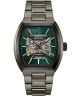 Bulova Maquina Skeleton Automatic 98A321 to męski zegarek o wyrazistym charakterze, który przyciąga wzrok otwartą tarczą typu skeleton w zielonym kolorze. Wewnątrz pracuje mechanizm automatyczny Miyota 8N26 z 21 kamieniami, widoczny dzięki ażurowej konstrukcji. Model ma kopertę i bransoletę w odcieniu szarości oraz szafirowe szkło z powłoką antyrefleksyjną. Wodoszczelność 50 m chroni zegarek przed zachlapaniami.
