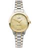 Zegarek damski Casio Classic Lady LTP-1128G-9AREF to delikatny model utrzymany w eleganckiej srebrno-złotej kolorystyce koperty i bransolety ze stali szlachetnej. Złota tarcza tworzy spójną i klasyczną kompozycję, a liniowe indeksy nadają jej uporządkowany, minimalistyczny charakter. Zegarek pracuje w oparciu o japoński mechanizm kwarcowy, a tarczę chroni szkło mineralne. Koronka umieszczona po prawej stronie ułatwia ustawianie czasu. Wodoszczelność na poziomie 30 metrów oznacza ochronę przed niewielkimi zachlapaniami, dlatego model najlepiej sprawdzi się w codziennych warunkach.