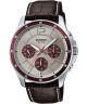 Zegarek męski Casio Analog MTP-1374L-7A1VEF to elegancka propozycja, w której klasyczna estetyka łączy się z rozbudowaną funkcjonalnością tarczy. Koperta w kolorze srebrnym została wykonana ze stali szlachetnej i połączona z brązowym, skórzanym paskiem. Na białej tarczy, chronionej szkłem mineralnym, umieszczono rozbudowany datownik, który dostarcza informacji o dniu miesiąca, dniu tygodnia oraz wskazuje czas w formacie 24-godzinnym. Pracę tego modelu wspiera japoński mechanizm kwarcowy. Wodoszczelność do 50 metrów odpowiada za ochronę przed zachlapaniami.