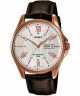 Elegancki męski zegarek Casio Classic MTP-1384L-7AVEF to kwarcowy model, na budowę którego składają się koperta w kolorze różowego złota, srebrna tarcza, szkło mineralne oraz pasek ze skóry w odcieniu brązowym. Zegarek posiada powłokę luminescencyjną oraz datowniki Day Date. Wodoszczelność wynosi 100m.