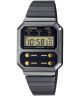 Elektroniczny Casio VINTAGE Maxi A100WEGG-1A2EF to damski zegarek kwarcowy upamiętniający swojego protoplastę z 1978 roku. Urządzenie składa się ze stalowej czarnej bransolety, czarnej koperty z tworzywa i czarnej tarczy. Model wyposażono w funkcje takie jak: 4 przyciski, sygnał godzinowy, automatyczny kalendarz, alarm dzienny, stoper, datowniki Day Date. Model pakowany jest w oryginalne opakowanie.