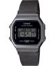Damski zegarek Casio VINTAGE Maxi A168WEMB-1BEF to model o ikonicznej stylistyce retro. Wyróżnia się kopertą w charakterystycznym kolorze gunmetal z osadzonym w środku cyfrowym wyświetlaczem. Obudowa łączy się z czarną bransoletą mesh. Model wyposażono w rozbudowany kalendarz, stoper, alarm, podświetlenie Illuminator, a także w czas dobowy. Wodoszczelność wynosi 30 metrów.