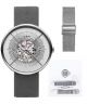 Zegarek Ciga Design J Series Zen Automatic Mechanical Skeleton J011-SISI-W35 pracuje na japońskim mechanizmie automatycznym Miyota 8N24. Jego płynną pracę można obserwować przez tarczę skeleton, chronioną przez twarde szkło szafirowe. Cyferblat składa się z trzech warstw odzwierciedlających harmonię filozofii Zen - oryginalny efekt dopełnia środkowy poziom składający się ze 120 cienko wyciętych srebrnych linii. Nowoczesny charakter i spójny styl podkreśla połączenie klasycznej koperty ze srebrnej stali szlachetnej 316L z szarym silikonowym paskiem nawiązującym do estetyki japońskiego ogrodu Karesansui.