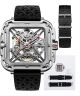 Zegarek męski Ciga Design X Series Gorilla Silver Skeleton Automatic X011-SISI-W25BK opiera swoje działanie o mechanizm automatyczny CIGA Design CD-01 Automatic, łożyskowany na 25 kamieniach, z 40 godzinami rezerwy chodu. To model o wyjątkowym designie z tarczą typu skeleton w kształcie litery X. Zabezpieczono ją szafirowym szkiełkiem. Dwupowłokowa konstrukcja jest wyposażona w pierwszy na świecie, czteropunktowy system zawieszenia antywstrząsowego. Kopertę modelu wykonano ze stali nierdzewnej 316L i połączono ją z silikonowym paskiem.