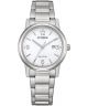 Zegarek damski Citizen Elegance Solar Eco-Drive EW2720-57A to elegancki model, który łączy nowoczesny design z funkcjonalnością. Wyposażony w mechanizm solarny Citizen E011, zegarek ten zapewnia wygodę użytkowania bez potrzeby wymiany baterii. Koperta zegarka wykonana jest ze stali szlachetnej w srebrnym kolorze, co nadaje mu subtelny blask. Tarcza w białym kolorze jest przykryta mineralnym szkłem, które chroni przed uszkodzeniami. Szerokość koperty wynosząca 31 mm sprawia, że zegarek jest delikatny i kobiecy. Bransoleta, również ze stali szlachetnej w srebrnym odcieniu, doskonale współgra z całością, tworząc harmonijną kompozycję. Zegarek charakteryzuje się wodoszczelnością do 30 m, co pozwala na codzienne użytkowanie bez obaw o drobne zachlapania. To doskonały wybór dla kobiet ceniących sobie styl i funkcjonalność w jednym.