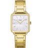 Zegarek damski Cluse La Tétragone CG10327 SET oferowany jest w zestawie z dodatkową bransoletką, co sprawia, że dobrze sprawdza się jako propozycja prezentowa. Koperta ze stali szlachetnej w złotym kolorze ma szerokość 29 mm i smukłą grubość 7 mm, a jej geometryczna forma podkreśla minimalistyczny charakter modelu. Złota stalowa bransoleta o szerokości 16 mm została dopasowana kolorystycznie do koperty, tworząc spójną całość. Tarcza z masy perłowej nadaje zegarkowi subtelny, dekoracyjny akcent, a jej powierzchnię osłania szkło mineralne. Za działanie zegarka odpowiada mechanizm kwarcowy. Wodoszczelność na poziomie 30 metrów umożliwia niewielkie zachlapania podczas codziennego użytkowania.