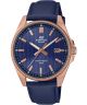 Zegarek męski Casio EDIFICE Classic EFV-150CL-2AVUEF do działania napędzany jest przez japoński mechanizm kwarcowy o 3-letniej żywotności. Kopertę w kolorze różowego złota wykonano ze stali szlachetnej z powłoką IP i połączono ze skórzanym paskiem w kolorze niebieskim. Niebieską tarczę zdobioną fakturowaniem uzupełnia datownik dni miesiąca oraz indeksy liniowe i wskazówki w kolorze różowego złota. Wodoszczelność modelu oszacowano na 10 ATM.