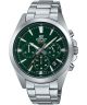Zegarek męski Edifice Standard Chronograph EFV-630D-3AVUEF to elegancki model utrzymany w sportowym stylu. Koperta o średnicy 44 mm oraz dopasowana bransoleta wykonane są ze stali szlachetnej w srebrnym kolorze. Zielona tarcza nadaje całości nowoczesny wygląd i wyróżnia model spośród klasycznych wersji. Zegarek wyposażono w chronograf do pomiaru czasu oraz datownik dnia miesiąca. Japoński mechanizm kwarcowy odpowiada za działanie modelu, a tarczę zabezpiecza szkło mineralne. Wodoszczelność na poziomie 100 metrów umożliwia pływanie powierzchniowe, co czyni go praktycznym wyborem do codziennego noszenia.