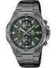 Zegarek męski Casio EDIFICE Chronograph EFV-640DC-3AVUEF wykonano ze stali szlachetnej z powłoką IP. Zieloną tarczę uzupełniają chronograf i datownik dni miesiąca. Wskazówki i indeksy pokryto powłoką Neobrite. Wodoszczelność modelu oszacowano na 10 ATM. Całość działa w oparciu o mechanizm kwarcowy.