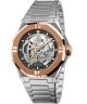 Zegarek męski Epos Sport Skeleton Automatic 3506.139.34.15.30 wyróżnia się czarną tarczą typu skeleton, która eksponuje pracę mechanizmu automatycznego Sellita SW200 z około 38-godzinną rezerwą chodu. Koperta w odcieniu srebra i różowego złota została wykonana ze stali szlachetnej pokrytej powłoką PVD, a całość uzupełnia stalowa bransoleta o dużych ogniwach. Model wyposażono w indeksy liniowe, podświetlenie Super-LumiNova oraz szkło szafirowe z antyrefleksem, które odpowiada za ochronę tarczy. Przezroczysty i zakręcany dekiel dodatkowo podkreśla konstrukcję zegarka. Wodoszczelność na poziomie 100 metrów umożliwia pływanie powierzchniowe.