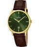 Zegarek męski Festina Classic F16747-5 to model w klasycznym stylu, którego koperta ze stali szlachetnej w kolorze złotym została zestawiona z brązowym paskiem skórzanym. Zielona tarcza ze szlifem słonecznym nadaje całości wyrazistego charakteru i została osłonięta szkłem mineralnym. Funkcjonalność zegarka uzupełnia datownik dni miesiąca. Za działanie odpowiada mechanizm kwarcowy. Wodoszczelność na poziomie 50 metrów chroni model przed niewielkimi zachlapaniami.