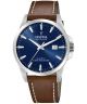 Festina Swiss Made F20025/3 to męski zegarek, który pracuje w oparciu o mechanizm kwarcowy Ronda 705. Niebieska tarcza, wyposażona w datownik dnia miesiąca i zabezpieczona szkiełkiem szafirowym, została połączona ze srebrną kopertą i skórzanym, brązowym paskiem. Klasyka kolorów sprawia, że model ten idealnie dopasuje się do większości odmiennych, codziennych stylizacji. Wodoszczelność klasy 10 ATM, zapewnia ochronę podczas pływania powierzchniowego. Producent przewidział 2-letnią gwarancję na zegarek oraz 5-letnią gwarancję na szkiełko.