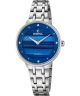Festina Mademoiselle F20600-A to zegarek damski w eleganckiej odsłonie. Model posiada srebrną kopertę ze stali szlachetnej o wysokości 31 mm oraz dopasowaną bransoletę w tym samym kolorze. Na niebieskiej tarczy umieszczono czytelne indeksy, a całość napędza mechanizm kwarcowy. Tarcza chroniona jest przez szkło mineralne, a wodoszczelność na poziomie 50 metrów zabezpiecza zegarek przed niewielkimi zachlapaniami.