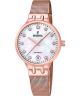 Zegarek damski Festina Mademoiselle F20716-1 to elegancki model, który łączy w sobie nowoczesny styl i klasyczne akcenty. Koperta zegarka wykonana jest ze stali szlachetnej w kolorze różowego złota, co nadaje mu subtelnego blasku. Tarcza w perłowym odcieniu jest przykryta szkłem szafirowym, które chroni przed zarysowaniami. Zegarek jest wodoszczelny do 50 metrów, co sprawia, że jest odporny na drobne zachlapania. Bransoleta typu mesh, również w kolorze różowego złota, doskonale komponuje się z całością, a szerokość koperty wynosząca 33 mm nadaje mu delikatny, a zarazem wyrazisty charakter. Dodatkowym atutem jest tarcza z masy perłowej, która dodaje uroku. To idealny wybór dla kobiet ceniących sobie styl i funkcjonalność w codziennym użytkowaniu.