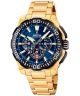 Zegarek męski Festina Chrono Bike F20727-1 to doskonały wybór dla aktywnych mężczyzn. Za jego działanie odpowiada mechanizm kwarcowy. Koperta zegarka wykonana jest ze stali szlachetnej w kolorze złotym, co nadaje mu elegancki wygląd. Tarcza w intensywnym niebieskim kolorze jest przykryta mineralnym szkłem. Szerokość koperty wynosi 46 mm, co sprawia, że zegarek ma solidny charakter. Bransoleta, również ze stali szlachetnej w kolorze złotym, doskonale komponuje się z całością. Zegarek charakteryzuje się wodoszczelnością do 200 metrów, co czyni go odpowiednim do pływania i nurkowania. Festina Chrono Bike to idealny wybór dla mężczyzn ceniących sobie styl i funkcjonalność.