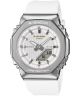 Zegarek damski Casio G-SHOCK Analog-Digital GM-S2110SH-7AER prezentuje lekką, sportową stylistykę dzięki białej kopercie i paskowi z tworzywa. Obudowa o szerokości 41 mm utrzymuje kompaktowe proporcje, a srebrny bezel dodaje całości delikatnego kontrastu. Biała, fakturowana tarcza przykryta mineralnym szkiełkiem została wyposażona w podświetlenie LED Super Illuminator oraz powłokę Neobrite. Zegarek oferuje datownik dni miesiąca i tygodnia, czas światowy, format 12/24 h, minutnik, stoper oraz pięć alarmów dziennych. Zakręcany dekiel wspiera utrzymanie wysokiej szczelności. Wodoszczelność 200 metrów pozwala na bezpieczne pływanie i nurkowanie bez akwalungu. Model działa w oparciu o japoński mechanizm kwarcowy i objęty jest 3-letnią gwarancją z możliwością jej przedłużenia.
