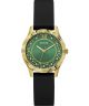 Guess Dress Starstruck GW0766L3 to damski zegarek utrzymany w eleganckiej, modowej stylistyce. Koperta ze stali szlachetnej została pokryta powłoką nadającą jej złoty kolor i zestawiona z czarnym paskiem silikonowym. Zielona tarcza tworzy wyraźny kontrast z kopertą i podkreśla charakter modelu. Za ochronę tarczy odpowiada szkło mineralne. Za działanie zegarka odpowiada mechanizm kwarcowy. Wodoszczelność na poziomie 30 metrów oznacza odporność na niewielkie zachlapania, na przykład podczas mycia rąk.