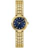 Zegarek damski Guess Ladies Gold Tone GW0930L4 to elegancki model utrzymany w złotej tonacji, wykonany ze stali szlachetnej pokrytej powłoką PVD. Granatowa tarcza tworzy wyrazisty kontrast, a połyskujące cyrkonie na kopercie oraz w roli indeksów dodają całości biżuteryjnego charakteru. Za pracę zegarka odpowiada mechanizm kwarcowy, a mineralne szkło chroni tarczę w codziennym użytkowaniu. Wodoszczelność 30 metrów oznacza odporność na niewielkie zachlapania.