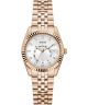 Zegarek damski Guess Jada Rose Gold Tone GW0936L4 to biżuteryjna propozycja utrzymana w odcieniu różowego złota. Koperta i bransoleta wykonane ze stali szlachetnej PVD tworzą elegancką, spójną całość. Srebrna tarcza nadaje modelowi subtelnego, klasycznego wyglądu, a datownik dni miesiąca zwiększa praktyczność zegarka. Mineralne szkło osłania cyferblat, natomiast mechanizm kwarcowy odpowiada za działanie modelu. Wodoszczelność 30 metrów chroni zegarek przed niewielkimi zachlapaniami.