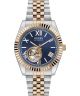 Zegarek męski Guess Open Heart 2-Tone Automatic GW0984G5 to biżuteryjny model o wyrazistej stylistyce, łączący srebro i różowe złoto w eleganckiej, dwukolorowej formie. Koperta wykonana ze stali szlachetnej pokrytej powłoką PVD została zestawiona z bransoletą w tym samym zestawieniu kolorystycznym, co tworzy nowoczesny i przyciągający uwagę wygląd. Niebieska tarcza została wzbogacona o charakterystyczne okienko open heart, które eksponuje pracę mechanizmu automatycznego, podkreślając wyjątkowy charakter zegarka. Model wyposażono w przezroczysty dekiel, dzięki czemu mechanizm jest widoczny również od strony nadgarstka. Tarcza jest chroniona szkłem mineralnym, a wodoszczelność 50 metrów oznacza odporność na niewielkie zachlapania oraz krótkotrwały kontakt z wodą, np. podczas mycia rąk.