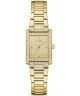 Guess Bonnet GW0995L2 to elegancki zegarek damski o biżuteryjnym charakterze, który świetnie podkreśla kobiece stylizacje i dodaje im luksusowego blasku. Model został wyposażony w precyzyjny mechanizm kwarcowy oraz kopertę ze stali szlachetnej pokrytej złotą powłoką PVD, dzięki czemu całość prezentuje się wyjątkowo stylowo i nowocześnie. Złota bransoleta ze stali szlachetnej PVD idealnie współgra z kopertą, tworząc spójny, elegancki design, a tarcza w złotym kolorze została ozdobiona kryształkami, które przyciągają wzrok i nadają zegarkowi biżuteryjnego wykończenia. Tarczę zabezpiecza mineralne szkło, a polerowane detale podkreślają dopracowaną formę. Koperta o szerokości 23 mm sprawia, że zegarek doskonale układa się na drobniejszym nadgarstku, a wodoszczelność do 30 metrów zapewnia ochronę przed przypadkowymi zachlapaniami. Całość uzupełnia grawerowany dekiel oraz koronka umieszczona po prawej stronie, a zegarek objęty jest 2-letnią gwarancją.
