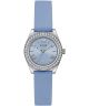 Guess Mini Luna GW1000L1 to damski zegarek o modowym charakterze i kompaktowej formie. Srebrna koperta wykonana ze stali została zestawiona z niebieskim paskiem z tworzywa, który nadaje modelowi lekki i nowoczesny wygląd. Niebieska tarcza utrzymana w spójnej kolorystyce z paskiem tworzy wyrazisty, ale harmonijny efekt wizualny. Kopertę zdobią cyrkonie, które nadają całości dekoracyjnego charakteru. Za ochronę tarczy odpowiada szkło mineralne. Za działanie zegarka odpowiada mechanizm kwarcowy. Wodoszczelność na poziomie 30 metrów oznacza odporność na niewielkie zachlapania, na przykład podczas mycia rąk.