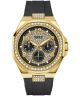 Zegarek męski Guess Empire GW1002G2 to propozycja dla osób, które lubią dodatki przyciągające uwagę i chcą wyróżnić swój styl mocnym akcentem kolorystycznym. Złota koperta ze stali szlachetnej PVD nadaje zegarkowi luksusowego wyglądu, a czarny silikonowy pasek zapewnia komfortowe dopasowanie i sportowy charakter. Wielokolorowa tarcza z kryształkami prezentuje się nietuzinkowo, a cyfry arabskie ułatwiają szybki odczyt godziny. Model został wyposażony w praktyczne funkcje, takie jak datownik dnia miesiąca i dnia tygodnia umieszczone na subtarcze oraz format 12/24 h, co sprawdza się w codziennym użytkowaniu. Tarczę osłania mineralne szkło, koronka znajduje się po prawej stronie, a wodoszczelność 50 metrów zwiększa swobodę noszenia w różnych warunkach. Duża koperta o średnicy 46 mm sprawia, że zegarek świetnie pasuje do sportowych i streetwearowych stylizacji.