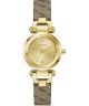 Guess Ginger GW1021L2 to elegancki zegarek damski, który łączy klasyczną formę z biżuteryjnymi detalami i ciepłą kolorystyką. Model wyposażono w precyzyjny mechanizm kwarcowy oraz kopertę ze stali szlachetnej pokrytą złotą powłoką PVD, co nadaje całości luksusowego wyglądu. Złota tarcza wyróżnia się dekoracyjnym giloszowaniem oraz subtelnymi kryształkami, które pięknie odbijają światło i podkreślają kobiecy charakter zegarka. Ozdobne indeksy nadają projektowi elegancji, a mineralne szkło chroni tarczę podczas codziennego użytkowania. Całość uzupełnia brązowy skórzany pasek, który zapewnia komfort noszenia i doskonale komponuje się ze złotymi elementami. Koperta o szerokości 30 mm i grubości 9 mm prezentuje się subtelnie na nadgarstku, a wodoszczelność do 30 metrów chroni zegarek przed przypadkowymi zachlapaniami. Model posiada polerowane wykończenie, grawerowany dekiel, koronkę po prawej stronie oraz objęty jest 2-letnią gwarancją.