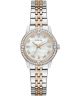 Guess Colette GW1027L5 to damski zegarek utrzymany w eleganckiej, modowej stylistyce. Koperta ze stali szlachetnej w srebrnym kolorze została zestawiona z bransoletą w srebrno-złotej tonacji, co nadaje modelowi ciekawy, dwukolorowy charakter. Biała tarcza wykonana z masy perłowej została ozdobiona cyrkoniami, które podkreślają dekoracyjny styl zegarka. Cyferblat pokrywa mineralne szkiełko osłaniające go przed działaniem czynników zewnętrznych. Za działanie zegarka odpowiada mechanizm kwarcowy. Wodoszczelność na poziomie 30 metrów oznacza odporność na drobne zachlapania, np. podczas mycia rąk lub w czasie niewielkiego deszczu.