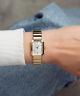 Herbelin Octogone 17556BP1N19 to elegancki zegarek damski w złotej oprawie, zaprojektowany z dbałością o każdy detal. Prostokątna koperta (20 × 27 mm) oraz bransoleta zostały wykonane ze stali szlachetnej pokrytej trwałą powłoką PVD. Subtelna tarcza z białej masy perłowej z wielokolorowym połyskiem dodaje całości lekkości i wyrafinowania. Wewnątrz pracuje szwajcarski mechanizm kwarcowy Ronda 751 o 2-letniej żywotności baterii. Model wyposażono w odporne na zarysowania szafirowe szkło o twardości 9 w skali Mohsa. Wodoszczelność do 50 metrów (5 ATM) zapewnia ochronę przed przypadkowymi zachlapaniami. Zegarek objęty jest 2-letnią gwarancją producenta.