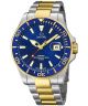 Jaguar Executive Diver J863/C to męski zegarek nurkowy o wodoszczelności na poziomie 20 ATM, zakręcanej koronce i obrotowym bezelu. Model do pracy napędzany jest przez szwajcarski mechanizm kwarcowy Ronda 6003.D, ze wskaźnikiem wyczerpania baterii EOL. Zarówno kopertę, jak i bransoletę wykonano ze stali szlachetnej PVD w kolorze srebrno-złotym. Niebieską tarczę uzupełniono o datownik dni miesiąca z lupą oraz powłokę luminescencyjną na indeksach i wskazówkach. Cyferblat przed uszkodzeniami zabezpieczono szkłem szafirowym.