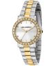 Karl Lagerfeld Crystals R0553100509 to damski zegarek o eleganckim charakterze, który wyróżnia się dekoracyjnymi kryształkami umieszczonymi na kopercie. Srebrna koperta ze stali została zestawiona z bransoletą w srebrno-złotej kolorystyce, dzięki czemu całość tworzy efektowną i wyrazistą kompozycję. Srebrna tarcza utrzymana w minimalistycznym układzie dobrze współgra z dwukolorową bransoletą. Za działanie zegarka odpowiada mechanizm kwarcowy. Cyferblat pokrywa szkło mineralne, które osłania go przed wpływem czynników zewnętrznych. Na tarczy znajduje się także mały sekundnik uzupełniający układ wskazań. Wodoszczelność na poziomie 50 metrów oznacza, że z zegarkiem można brać prysznic lub kąpać się w wannie.