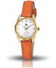 Lip Himalaya 671608 to elegancki zegarek wyprodukowany dla kobiet. Koperta w złotym odcieniu jest połączona z pomarańczowym paskiem uszytym ze skóry bydlęcej. Szkiełko mineralne chroni biały cyferblat przed uszkodzeniami zewnętrznymi. Na powierzchni cyferblatu ze złotymi elementami znajduje się subtarcza z sekundnikiem.