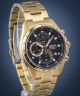 Lorus Sports Chronograph RM358HX9 to męski zegarek ze stali szlachetnej w kolorze złotym. Na czarnej tarczy znajdują się datownik dni miesiąca, chronograf i tachymetr. Wskazówki i indeksy pokryto powłoką luminescencyjną. Cyferblat przed uszkodzeniami zabezpieczono szkiełkiem mineralnym. Wodoszczelność na poziomie 10 ATM pozwala na pływanie powierzchniowe z zegarkiem na ręku. Model działa w oparciu o japoński mechanizm kwarcowy VD57.