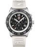 Okrągła koperta z czarnym bezelem oraz biały pasek z wygodnej gumy tworzą męski zegarek Luminox Pacific Diver Chrono 3140 Series XS.3141.SET. Czarny cyferblat został pokryty szkiełkiem szafirowym dla ochrony przed uszkodzeniami zewnętrznymi. Urządzenie pracuje w oparciu o szwajcarski mechanizm kwarcowy, którego bateria pracuje około dwóch lat. Model zawiera datownik Day Date, chronograf oraz podświetlenie trytowe, które działa do 25 lat. Do setu dołączony jest dodatkowy gumowy pasek w kolorze czarnym.