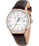 Zegarek Maserati Sorpasso Automatic R8821124002 to elegancki model o wyrazistym, klasycznym charakterze. Koperta w kolorze srebrnym została wykonana ze stali szlachetnej i połączona z brązowym skórzanym paskiem. Wewnątrz pracuje automatyczny mechanizm Miyota 82S0 z 21 kamieniami łożyskującymi. Tarcza w odcieniu brązu ma wykończenie w postaci szlifu słonecznego i zdobiona jest elementem open heart, który odsłania fragment pracy mechanizmu. Na jej powierzchni znajduje się powłoka luminescencyjna ułatwiająca odczyt godziny w słabym świetle. Zakręcany dekiel zwiększa szczelność, a wodoszczelność na poziomie 100 metrów umożliwia pływanie z zegarkiem.