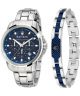 Maserati Successo R8851121016 to męski model wykonany z najwyższą drobiazgowością. Stalową kopertę połączono z dopasowaną bransoletą, całość utrzymano w srebrnej kolorystyce. Granatową tarczę wyposażono w datownik dni miesiąca, subtarczę z czasem 24-godzinnym, chronograf i tachymetr, ponadto szkiełko mineralne chroni cyferblat przed uszkodzeniami zewnętrznymi. Zestaw zawiera dodatkową bransoletkę.